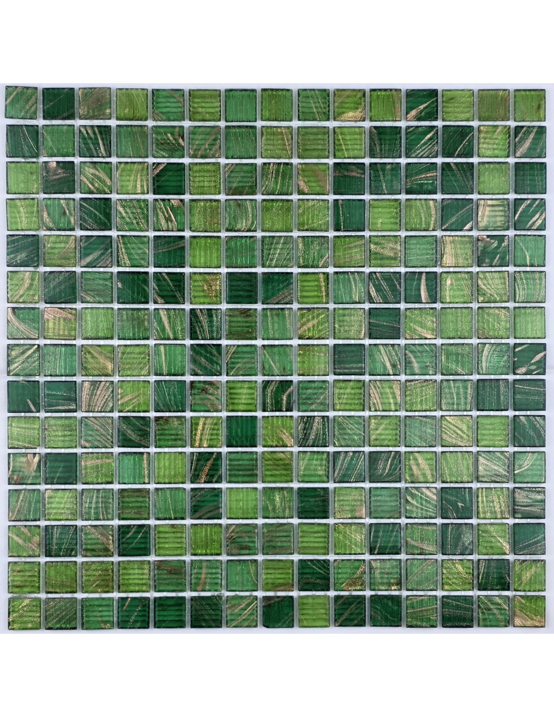 Смальтированная стеклянная мозаика, поверхность глянцевая с авантюрином. Размер чипа 20*20 мм.